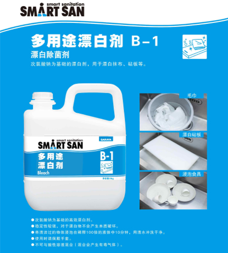 采用次氯酸钠作成份的食用级消毒剂,用于消毒砧板和餐具或漂白毛巾和表面。