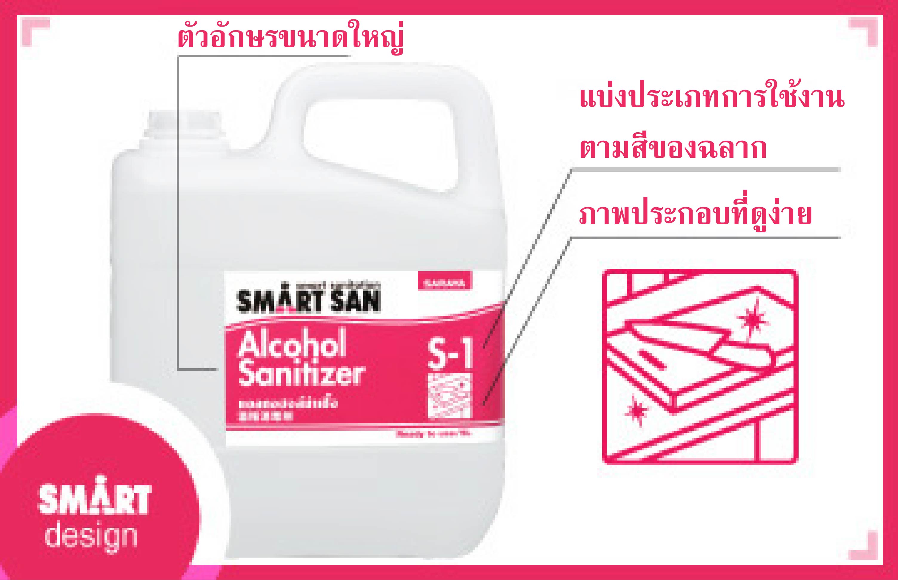 ฉลากน้ำยาจะแสดงชื่อและประเภทของน้ำยาด้านข้างแกลลอนด้วย จึงง่ายต่อการจัดเก็บและหยิบใช้งาน